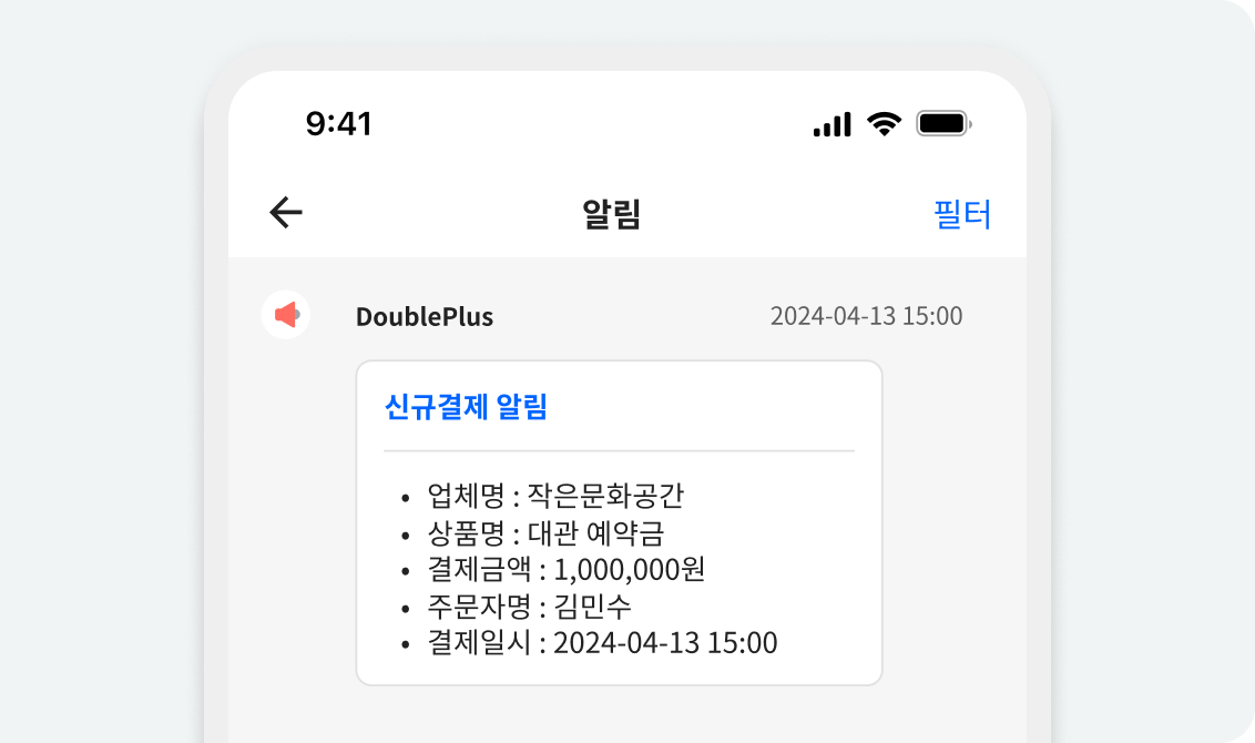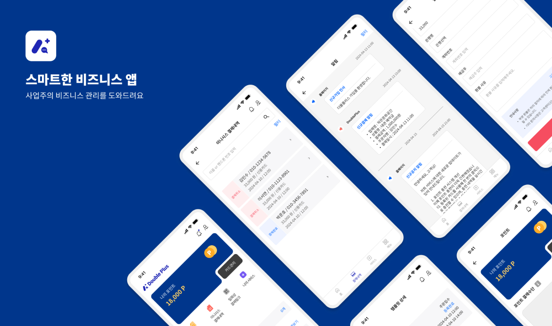 자사 전용 비즈니스 app(더블플러스)에서 결제관리, 온라인 결제 링크 생성, 실시간 알림, 서버 접속 통계 등 다양한 기능들을 경험하실 수 있습니다.
