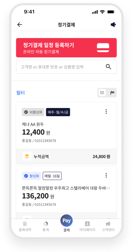일일이 결제를 요청할 필요 없이, 한 번의 설정으로 매달 고정적인 매출을 확보하세요.